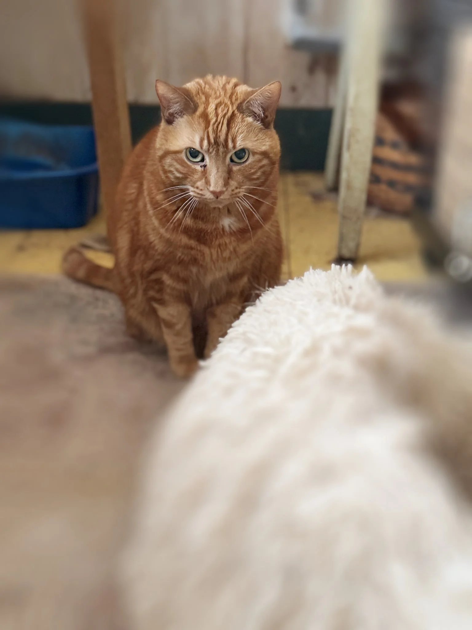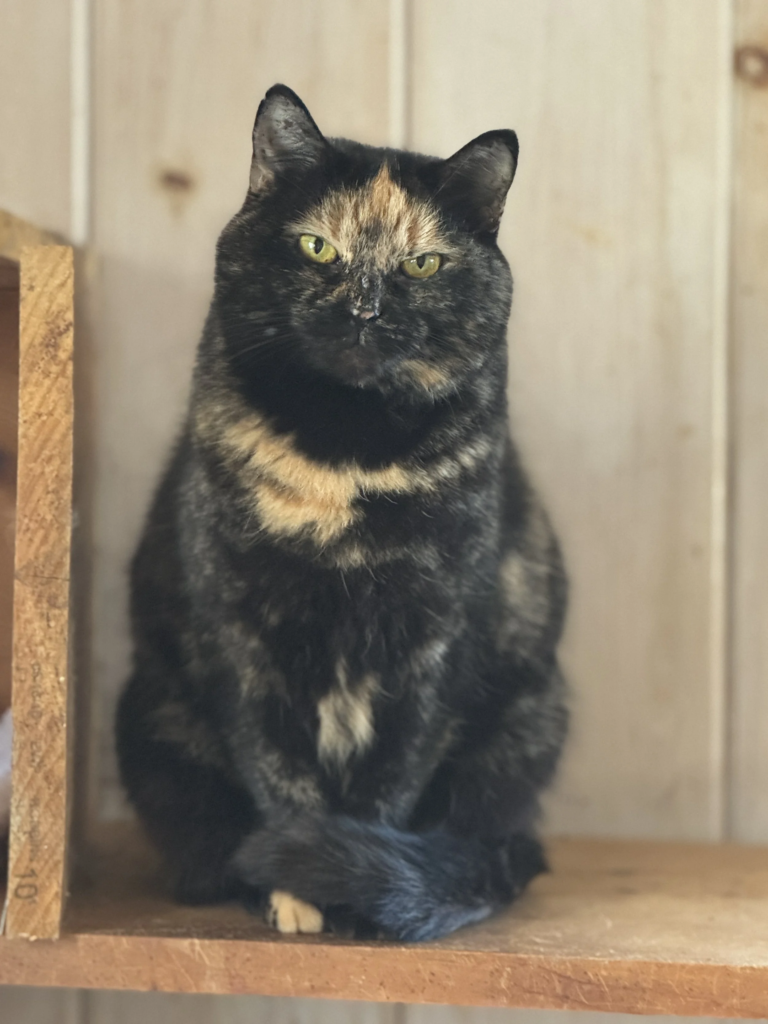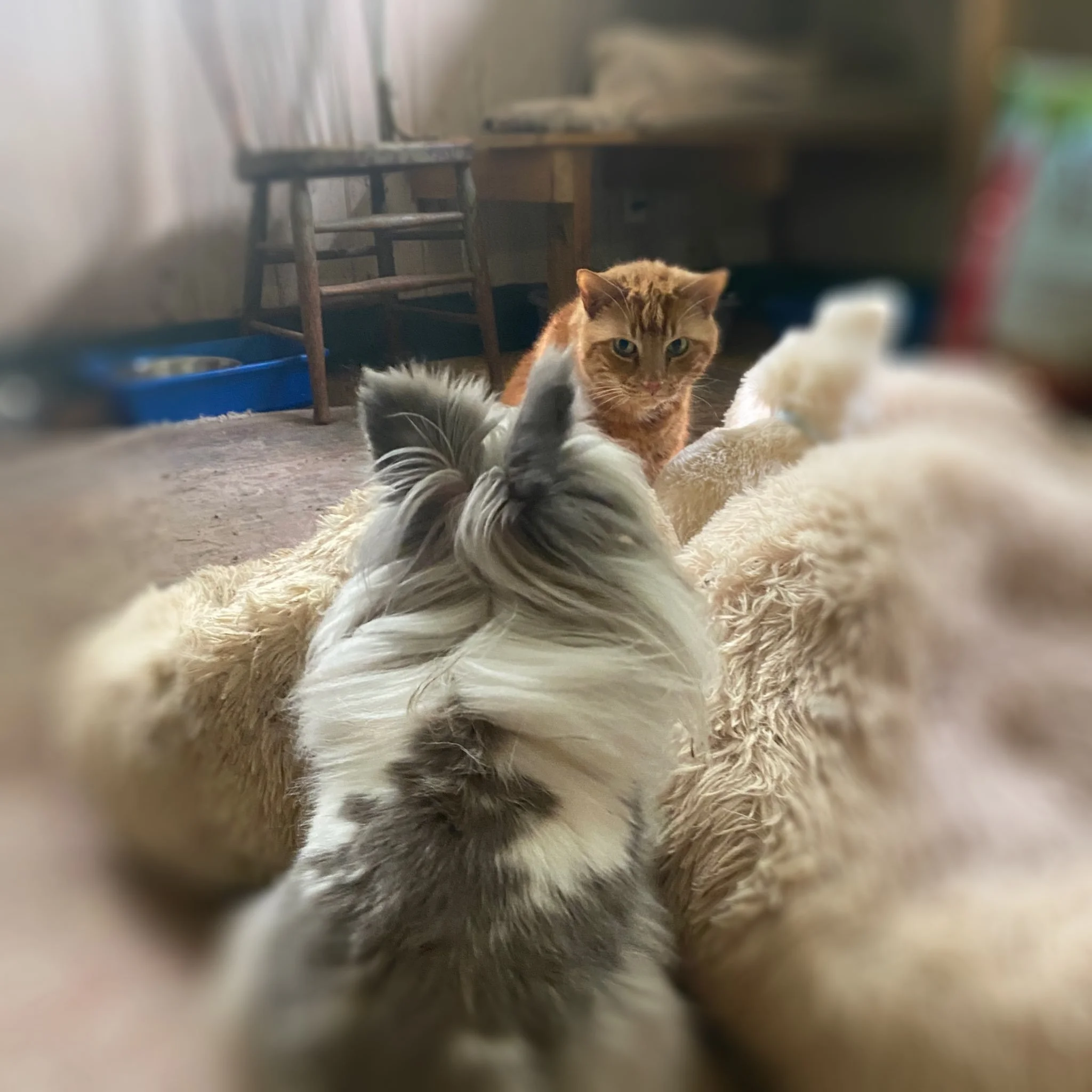 Claire [15+ lost her elder owner]; Peach, Orange, Tippy [raised by a woman who died of cancer and she told her family about us before she passed]; Nuffy and Jonathan [elders who lost their owner]; Francine [arrived and we were unable to touch her, took two years but now she loves petting]; Robby and Salty Fritz [neglected and eventually lost his home in a fire]; Omar and Oscar [brought in together as father-son from an overcrowded breeding home]; Franklin Muffinpants [farm cat needing home]; Petula Puffins [brought in after surviving the death of her mother in birth, was extremely malnourished and 1/3 normal size];